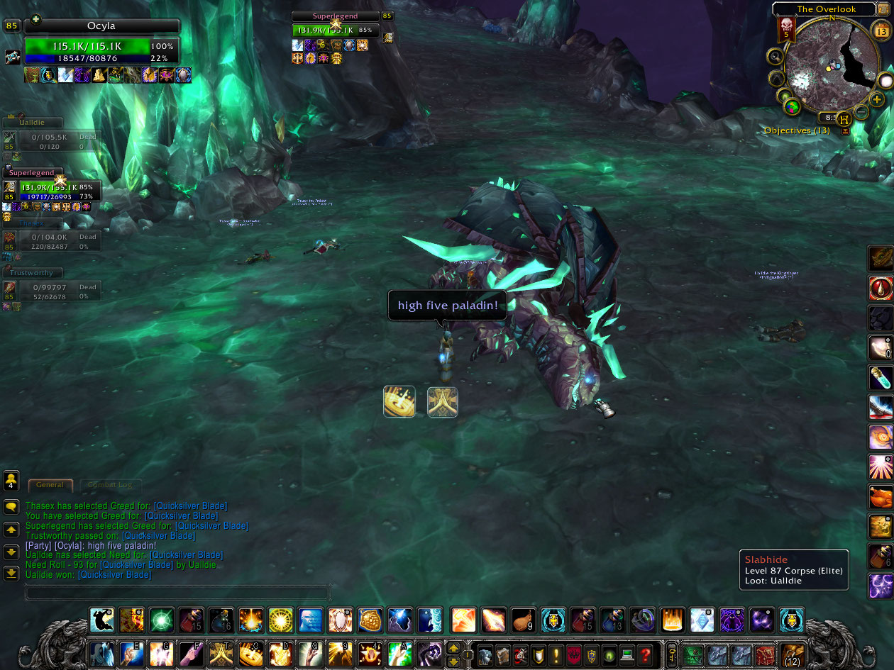 I get in a Heroic Stonecore, and we die, and die, and die. Oh and we die. The paladin and I took out Slabhide alone, at the end, though. The paladin didn’t know the last two fights, so that was fantastic.