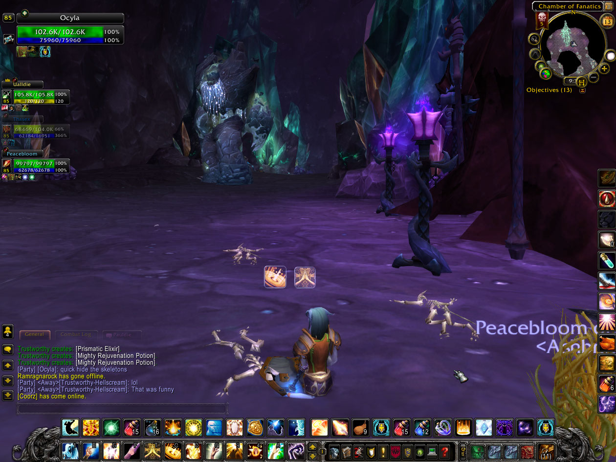 However after about 3 more wipes on Ozruk, the tank said he was lagging and presumably relogged, and the group kicked him with a quickness. I crack a joke about that, since skeletons all over the ground just cry failure.