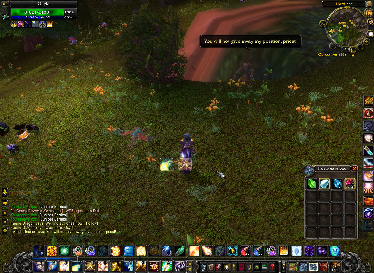Besides all that, wow! I finished Vashj’ir today! Well, first I started out in Hyjal to get my rep up to friendly so I could take the tabard. There is some good healing gear to be had at exalted. This quest was kind of cute with the fairy dragons helping you find stealthed cultists by feeding them berries. Find I have Herbalism I can see the berries on my map.