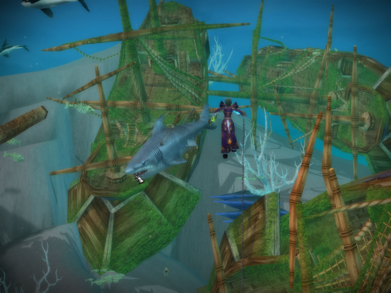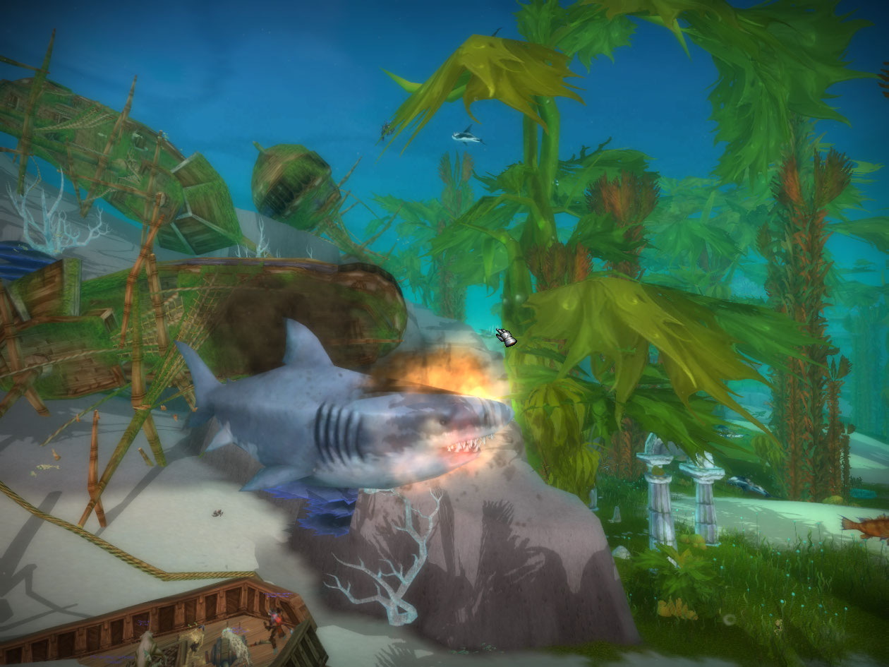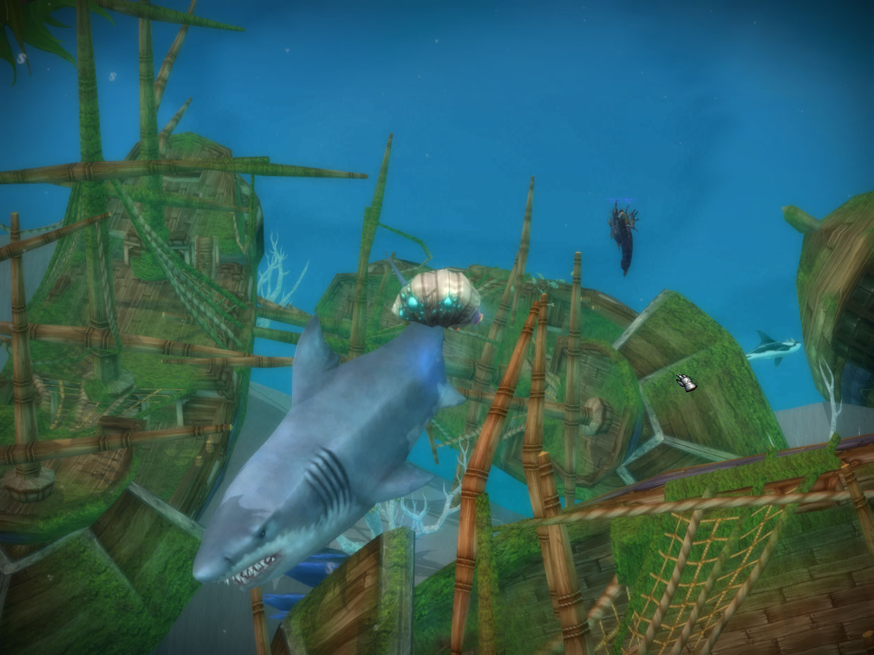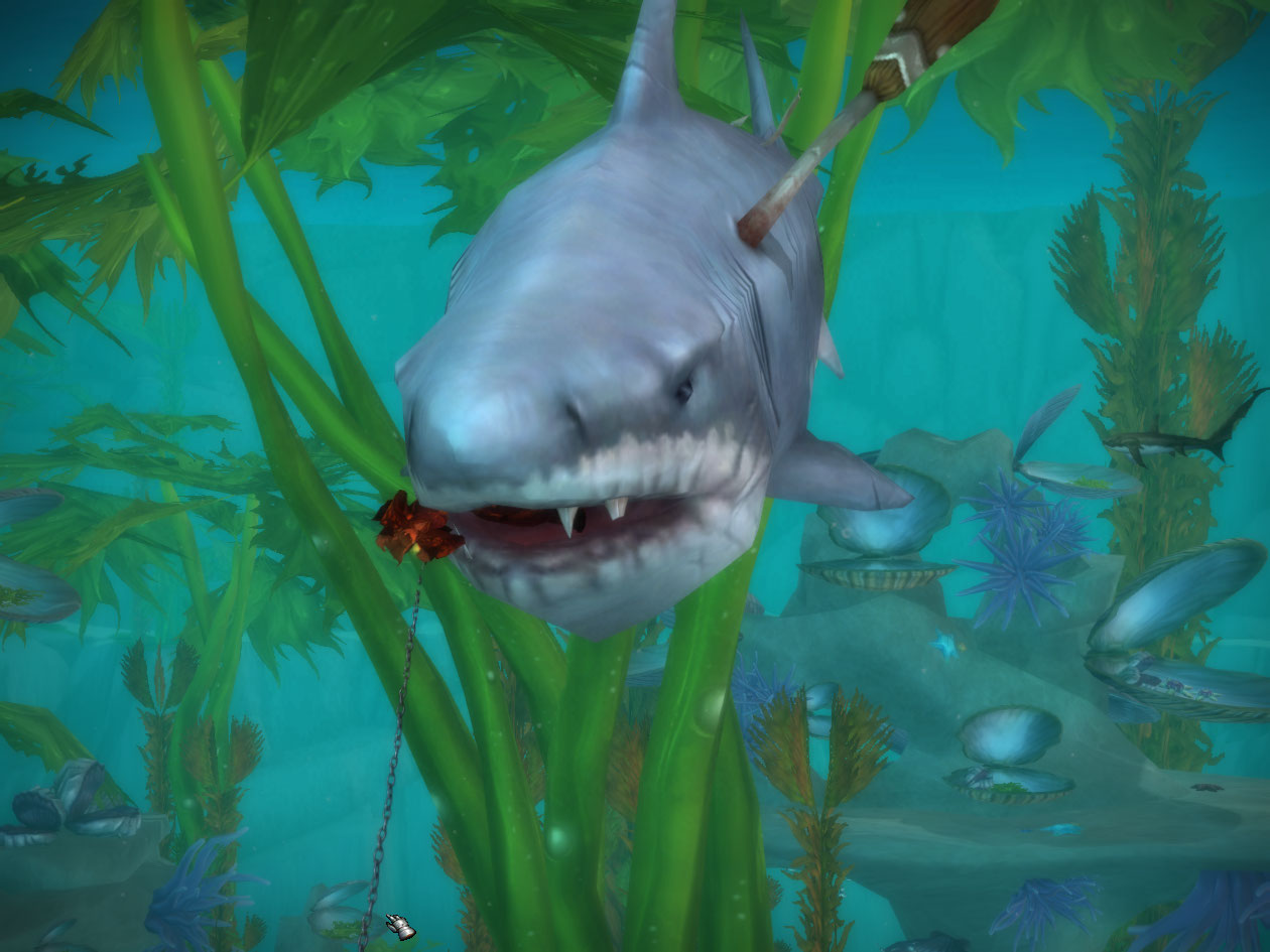 Apparently seeing how the bomb didn’t kill the shark is not putting off this guy though and he wants me to risk myself to get whatever he’s going after. The quest name is DUN-dun-DUN-dun-DUN-dun.. lol I run out with a chain and catch the shark, then fire a giant harpoon at it.