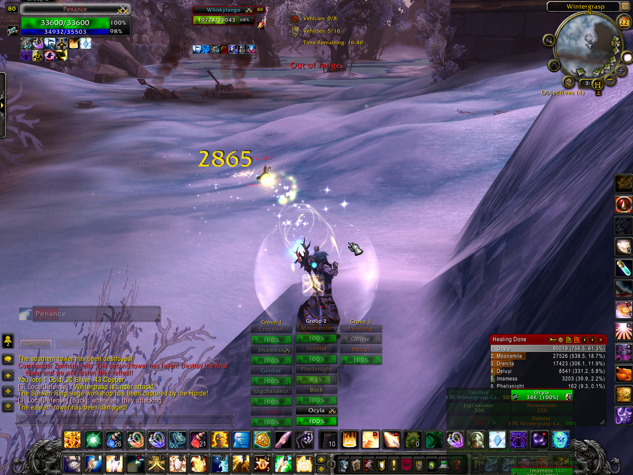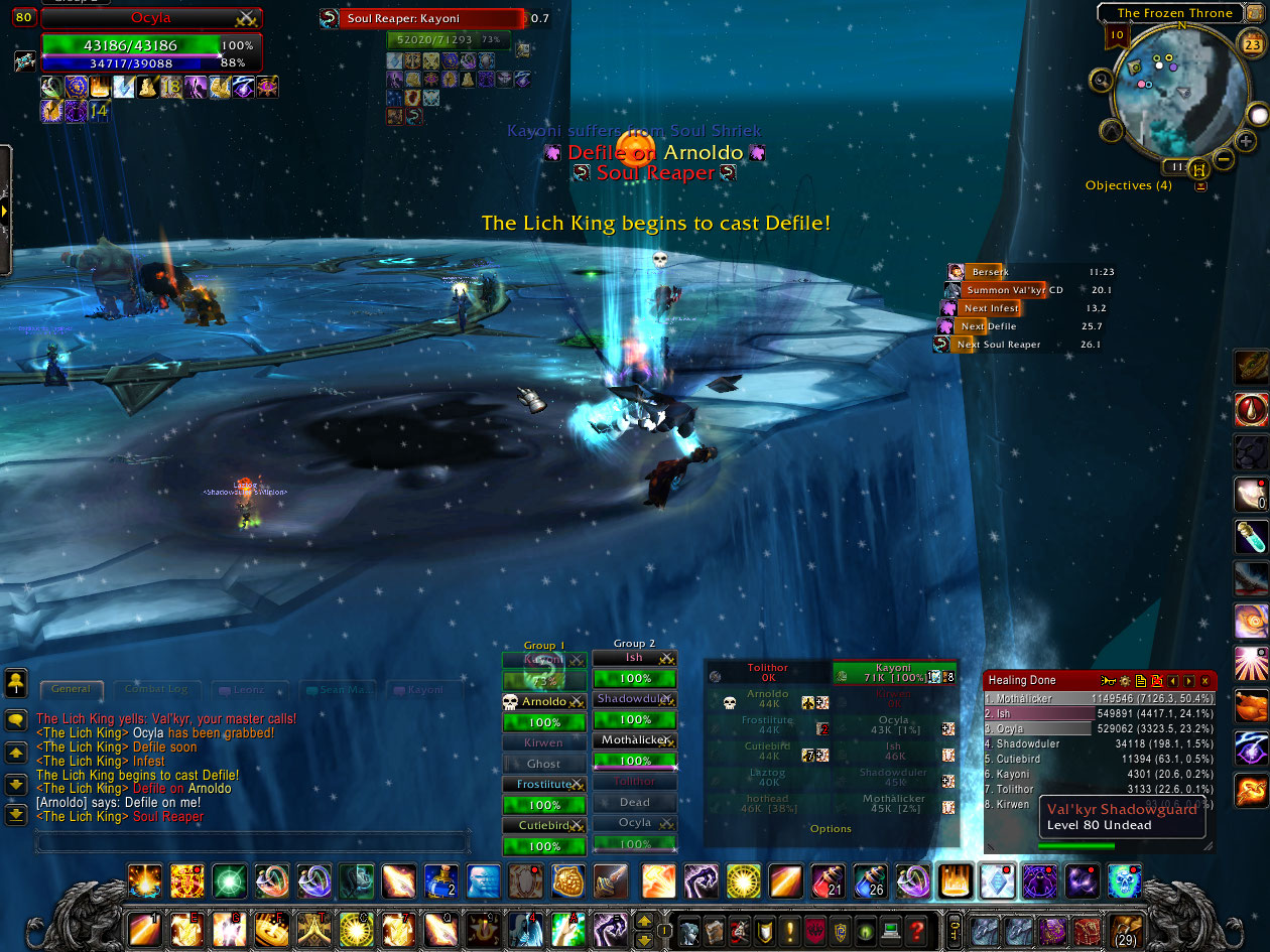 We decide to try for LK because they say the title will be taken out tomorrow, and claim we’ll get it no problem. The other priest complains we don’t need two disc priests so to prevent whining I switch to holy. Despite the positive outlook, we fail repeatedly during the Valks and Defile. On the 5th or so attempt I get picked up, someone drops a Defile right under the Valk, and I get carried off and dropped to my death.