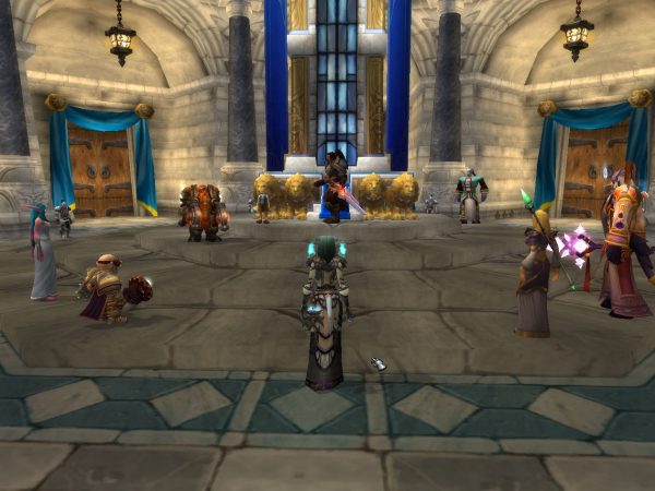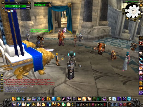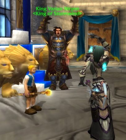 The Stormwind Guards just watch me kill it though and do not help. After I kill 5 I return to Anton and he worries that people will abandon the Light for promises of power and immortality. Now I get to speak to the King, prrrrow. Waiting for people to move so I can take a shot takes a while.