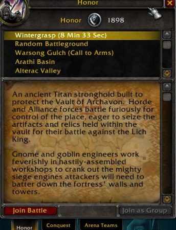 The battlegrounds are Warsong Gulch, Arathi Basin, Alterac Valley, Eye of the Storm, Strand of the Ancients, and Isle of Conquest. I believe I’ve talked about all these as well since I like to do them at least once a day. These each have their own objectives too. Thing is about these is you can queue for them at any time, sometimes without needing to wait, which all depends on the server. On my server you can chain battlegrounds immediately just about all day long. And these, unlike WG, are instanced so if one is full, another one will start up. Battlegrounds can earn you exp as well as honor and if you win, you receive quite the decent chunk of exp. I levelled from 78 to 80 over a weekend in the Call to Arms (featured) battlegrounds.
