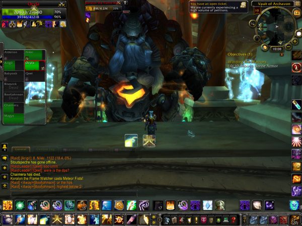 I then catch a VOA 10 because I figure I can use the messed up interface to heal at least 10 people with no problems. The RL says he wants to do a full clear and heads to the fire boss first, which no one ever does, so me and the other healer, and one tank start to head down to frost, and the rest go to fire, resulting in a total group wipe. Seriously, no one ever starts with fire. The fire boss goes badly, anyway.