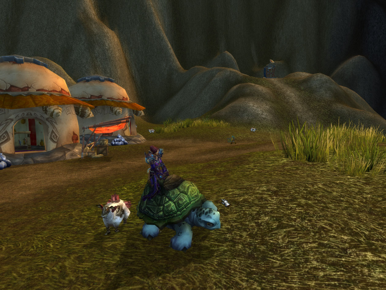 I log in and get my 6th anniversary achievement, and take some pictures of the little hobbit-like homes in the Loch Modan area that I like a lot.