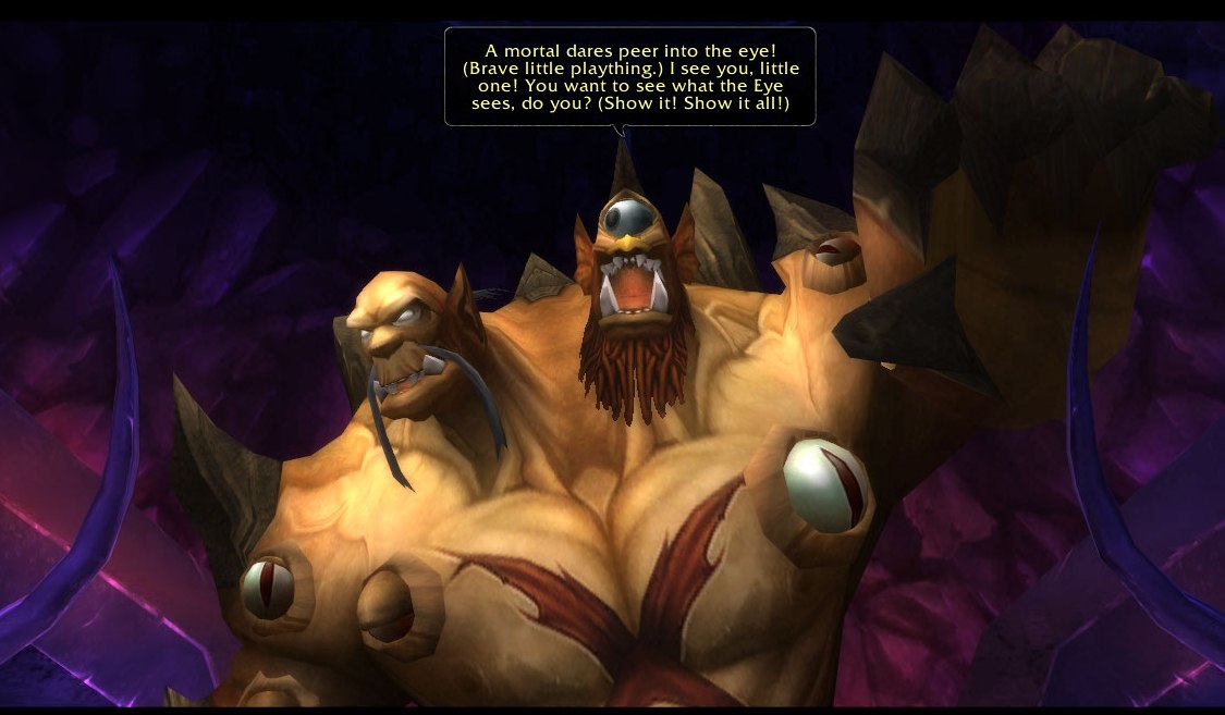 I picked up on my quests out in Twilight Highlands again, and this cut scene was pretty cool seeing that the monsters detects you are watching, calls you out directly, then slams you out of the scrying orb you are using, and whispers what a punk you are.