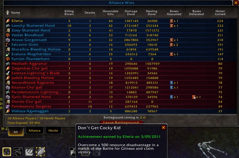 Did several bgs today, and won most of them. Even got the Achievement, Don’t Get Cocky, Kid, in a Battle for Gilneas by coming back after being down 500 points. I had 5 killing blows, 1 death, and 44 HKs. I made a point of killing that Onicks person, at least 6 times too.