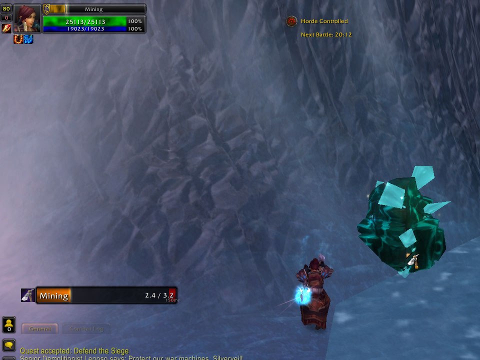 I check my PVP tab and Wintergrasp isn’t for another 40 minutes. Horde controls it currently. I fly out there anyway and start mining, waiting for the battle to start. I pick up my Wintergrasp quests then head out.