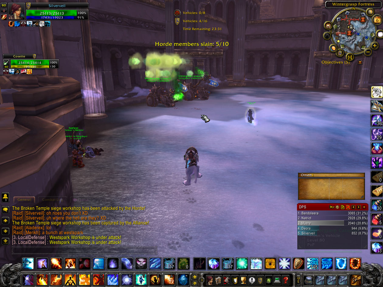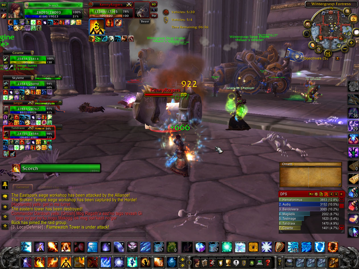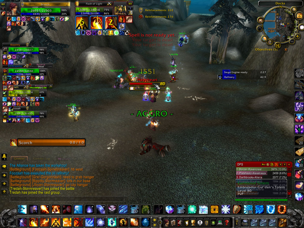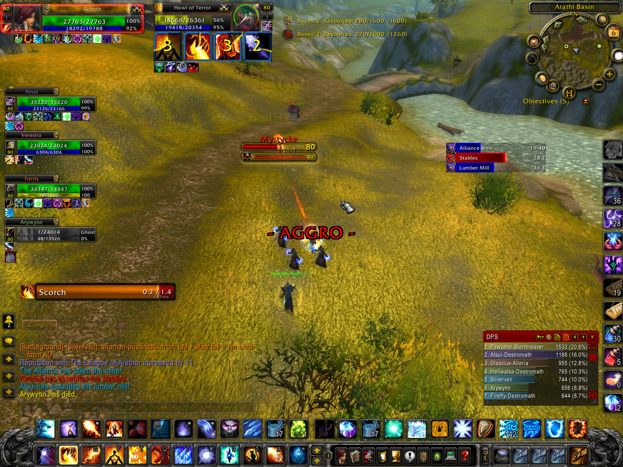 I start off running up to Lumber Mill (LM) but got blasted off by a damn Shaman, caught myself with Slow Fall and flew all the way to the Farm where I stayed for a while. The dilemma here is the battle really needs all members on a voice comm because information gathering is crucial. Both sides have up to 15 people and need to capture (cap) more resources than the other. Since there are a limited amount of people you need to communicate who is where, where the enemy is, where they are going, and where you should head to. So if 10 horde are at the Farm, up to 5 others are somewhere else, meaning they are thinly spread on the other locations.
