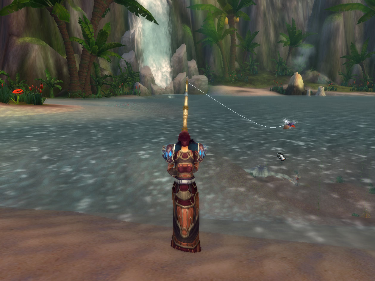 I pull out my epic fishing pole I earned from getting exalted status with the Kalu’ak and start fishing, pulling up useful fish like Barrelhead Goby (which I can use to make food for my priest), Pygmy Suckerfish (to make Pygmy oil on my priest which is useful in Alchemy), and Nettlefish which I use in multi serving Fish Feasts with my Cooking skill. It takes about 10 casts and I catch the Phantom Ghostfish, and eat it, which turns me invisible and complete the quest.