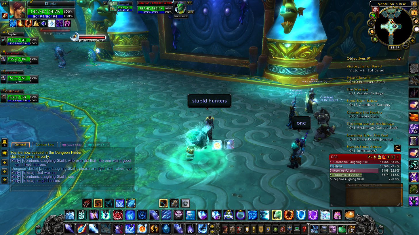 For some reason I had never finished Heroic Throne of Tides, which I did today. We wiped at least 7 times, 2 of which I avoided, and we ended up kicking a bad hunter doing 5k dps, using a tank pet. When they told him to bring out a dps pet, and the guy had no idea what to do. I did a vote kick with the reason “too stupid to play” which the other members enjoyed as the guy was kicked.