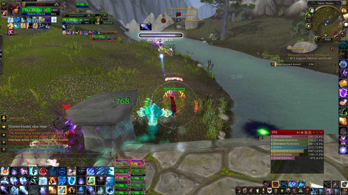 Later on I did my daily bg win and who should I run into but Ladiesman on his warlock, and yes I tried to beat his ASS. He had a druid healer on him that the other alliance weren’t taking care of. Top 3 attacked, Joeshagwell, 58%, next person, 14. Ha ha. We lost miserably, then went on to crush horde in a SoTA.
