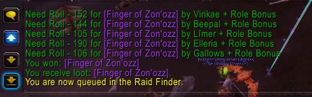Ran the first 4 bosses in LFR on my mage and won Finger of Zon’ozz. It’s a minor, minor upgrade, and I was going to give it to the next highest rolls but the priest who was second highest left, and I’m just not being nice to another mage I’m sorry. Well, that and they all had the same wand as me already, so f’em. Lost rolls on my tier shoulders, legs, and helm. BH dropped no cloth at all.