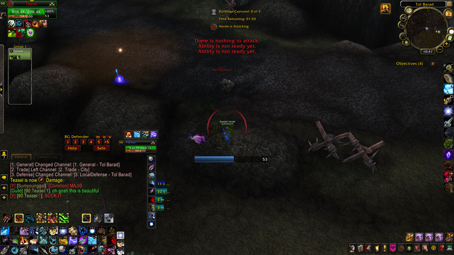 Phased into a Tol Barad battle with 5 alliance staring me in the face. Warrior, mage, holy priest, paladin of some sort, rogue. KILLED. THEM. ALL. Couldn’t screenshot everything because it lags me, but got close.