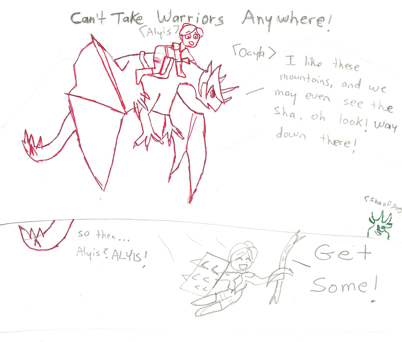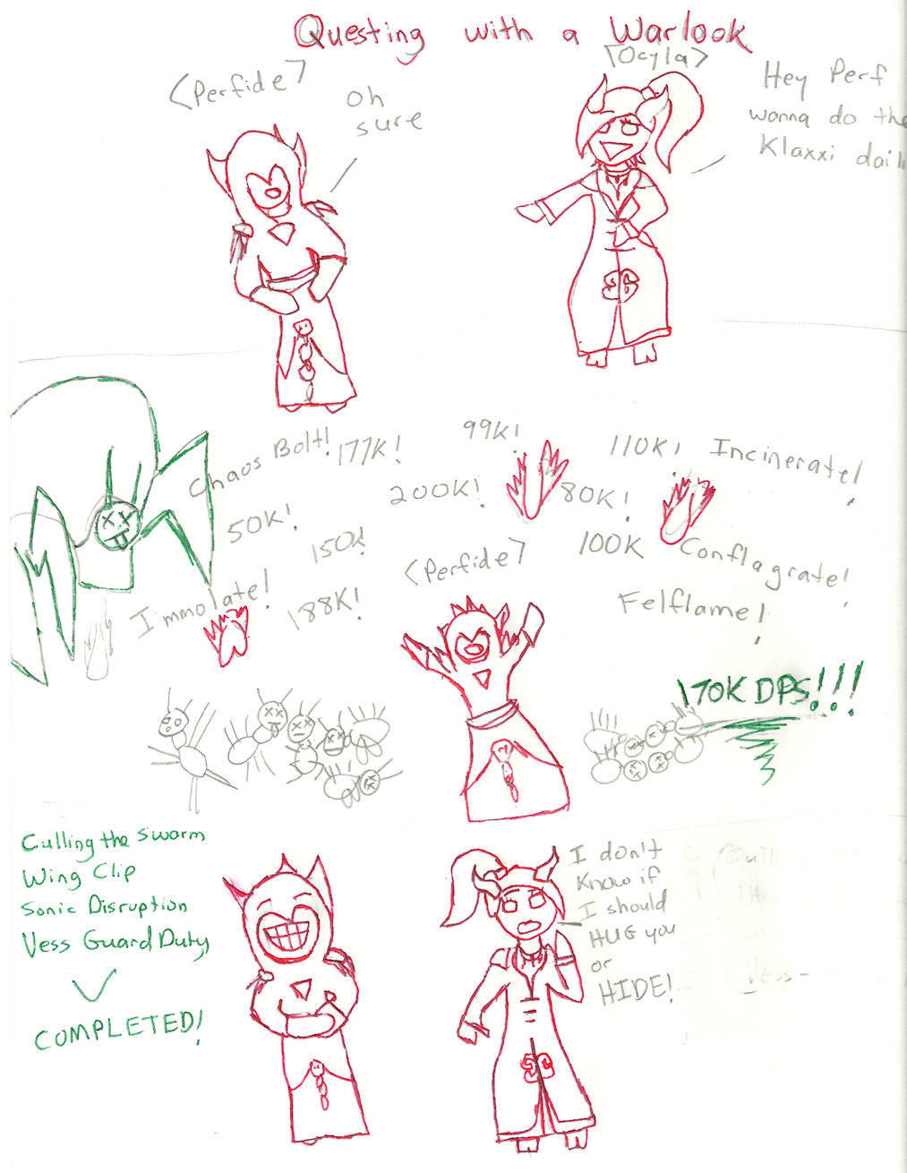 Perfide is Insane Nov20 A few of my scribbles based on real game events! Questing with Perfide: Sightseeing with Alyis Both are almost exactly how it happened! Alyis DID jump off me, melee’d the Sha for a tick, then ran away and survived!! lol