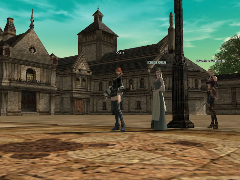 At Gludin I find both the Newbie Guide and the Adventurer Guildsman in the center of the plaza not far off from the Gatekeeper.