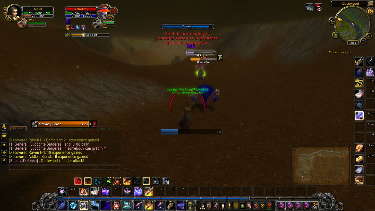 I tried to quest in Hellfire. Yep. I watched a 90 orc warrior smash a mage in front of my face. Then as I waited to die, he waved. A 90 mage and ele shaman fell from the sky and blasted me into the canyon. I disengaged to survive the landing, only to be smoked by a 90 rogue. Good times.