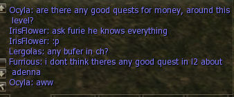 I also ran out of MP for one of the first time and sat down for roughly 7 mins to get it all back. Clan chat is lively though. I asked what quests are good at my level for money and they inform me that Furrious knows everything. He says he doesn’t think there are any good quests in l2 about adena.