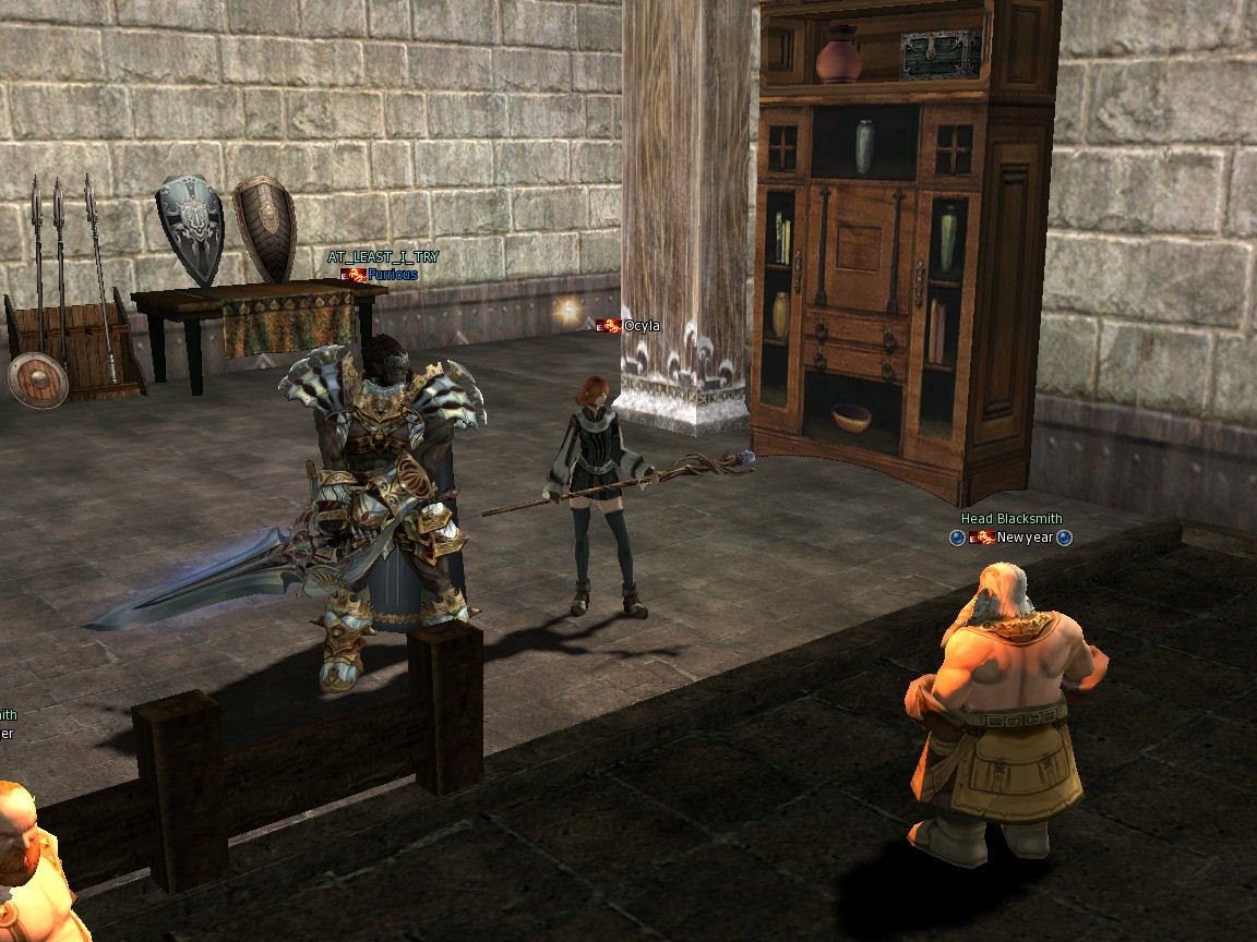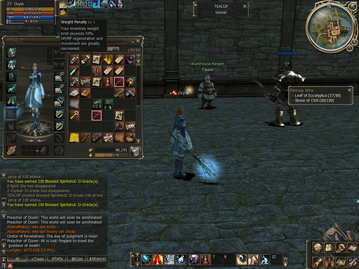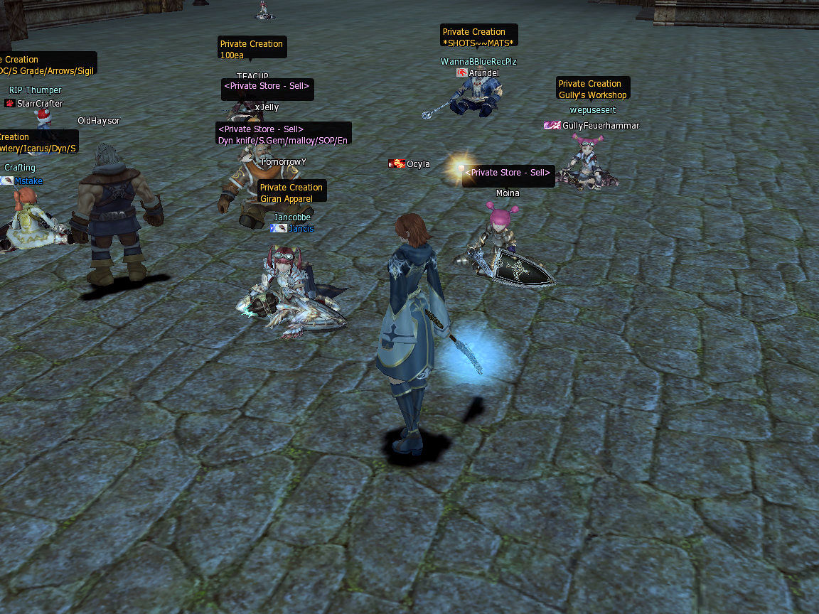 There are no spiritshots (sps) in Dion and decide to try the next town over, Giran. I do not see any here either. This is also where I am finding new shops, the yellow buy shops where people are buying the things they need. I also locate the more yellow shops called Private Creation where I can craft things, apparently.