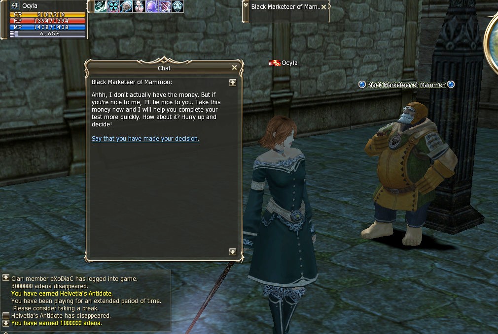 Furrious asks me to come to clan hall again then gives me 3 mill adena, and says I can keep it or do the quick class change, “either way its urs”. That’s very nice! (I’m serious when I say I’d give anything to never, ever had to do Trust or Scholar EVER AGAIN)