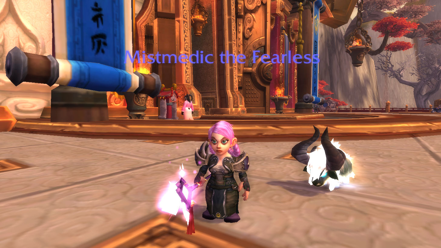 Think Pink Jun18 Finished up the gnome transmog! I wanted MORE pink, but too much pink is just… too-too… so went with some grey robes I liked the neckline on. I like the combo of grey and pink besides all that. Plus the gnome-hate is DELICIOUS!