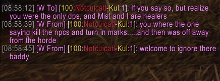 It was us two (heals), a severely undergeared and clueless DK, another DK tank, and a fifth-seventh slots which kept leaving constantly when they saw we weren’t winning. Horde was ROLLING us. We couldn’t counter their group of entirely rogues and ferals. The decent DK raged out calling us the WORST ASHRAN PLAYERS EVER and then I got treated to this little bit: