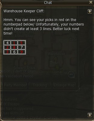 I sent the C grade armor and my thanks, back to him and go back to Outlaw Forest. I get a level 52 life stone drop. Today my hills are busy with 2 other players so I move slightly and start picking up quest items for Warehouse Keeper’s Pastime, which I forgot I picked up in Oren a while back. I also get a mid grade 55 LS. at 70% I decide to take a break and head back to Oren and talk to the WH keeper. I only received 15 metals in my time out so I pick my numbers and win nothing! Yay! I log out for now.