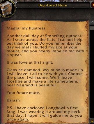 P.S. I will keep Longhowl’s fang safe. Attached is my own good luck charm – the foot from my first successful snare. Bring it safely to me, or I will gut you like a hare!