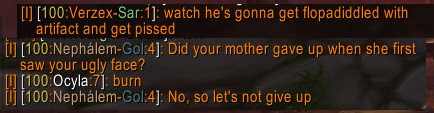 As for the SM thing, it started out when regular form-goers wanted to play together, and managed by Smellybeard, a dwarf shaman, we did wargames together for a few months. When that went under because of drama from a few people, Mizriz and Barrym took over in the fight against Hydra, to do premades in AV. We started calling ourselves the Forum Militia, but since everyone didn’t haunt the forums, we went with Stormpike Militia (SM). When we had even numbers, we stomped Hydra with DAS BOOT, which I streamed for posterity. That’s where we’re at now, doing premade AV mostly trying to ferret out Hydra, but since they specifically said they wouldn’t queue on the days WE queue, it’s been harder to run into them.