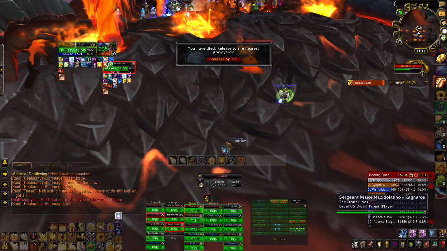 During Fall of Deathwing there was a priest by the name of Healuranus from Stormrage who appeared to be trying to jump off the edge in Ultraxion. I think I said something about it, not realizing what they were trying to do at the time. During the boat I made a comment that priests are ‘douches’ which they told me to take back and I refused on the grounds that I have a priest. And in pvp, I’m quite a bit of a jerk, no lie. Nothing outside of skill mechanics, but tearing off pally wings, mage ice block, hero, pally bubble, MCIng people off edges, is all somewhat jerky,. but fun and it helps my team win. Anyway.