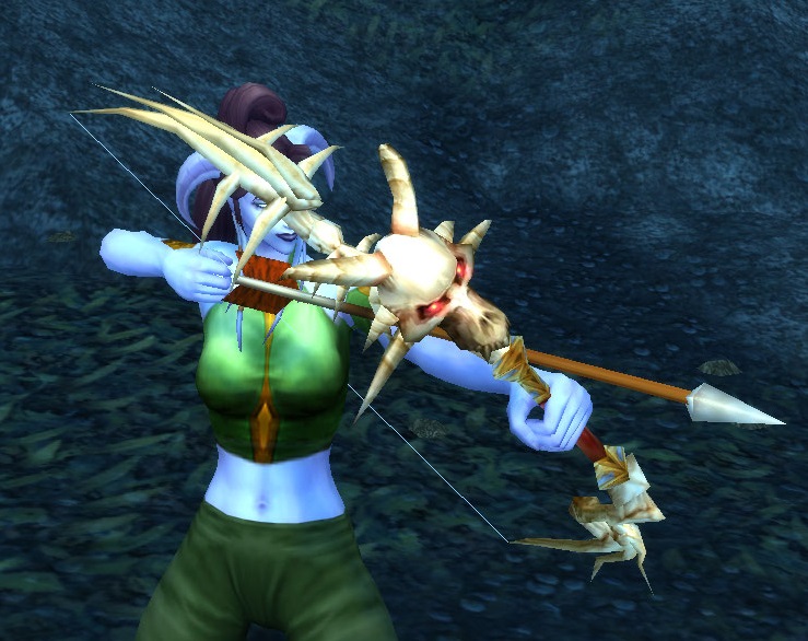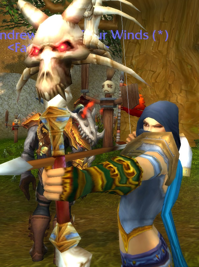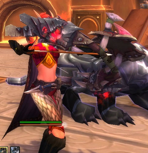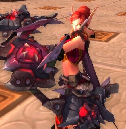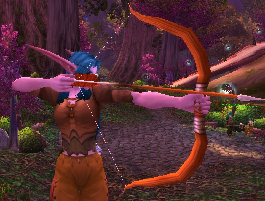 I decided to try to power level my hunter, who was originally human, to blood elf. Only, the way they hold the bow looks really, really weird. Was it always this way? I don’t recall. Shaco pointed out they use a bow like a cross bow. It looks ridiculous.