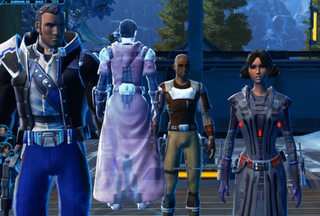 So! for an older game, it can be quite pretty. I spent so long looking for an outfit the game logged me out. Apparently actively looking through the Galactic Market will do that? Anyway I played with some dyes but I figured wearing a white/grey would be pretty ironic and left it like that.