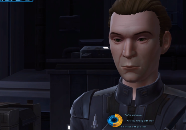 OMFG, what else can I say? I really don’t get the SWTOR dialog options sometimes. I got presented with a dialog choice with Talos, my cute little nerd for “are you flirting with me?”. I was excited because I thought I’d say that all flirty and get flirty options back.