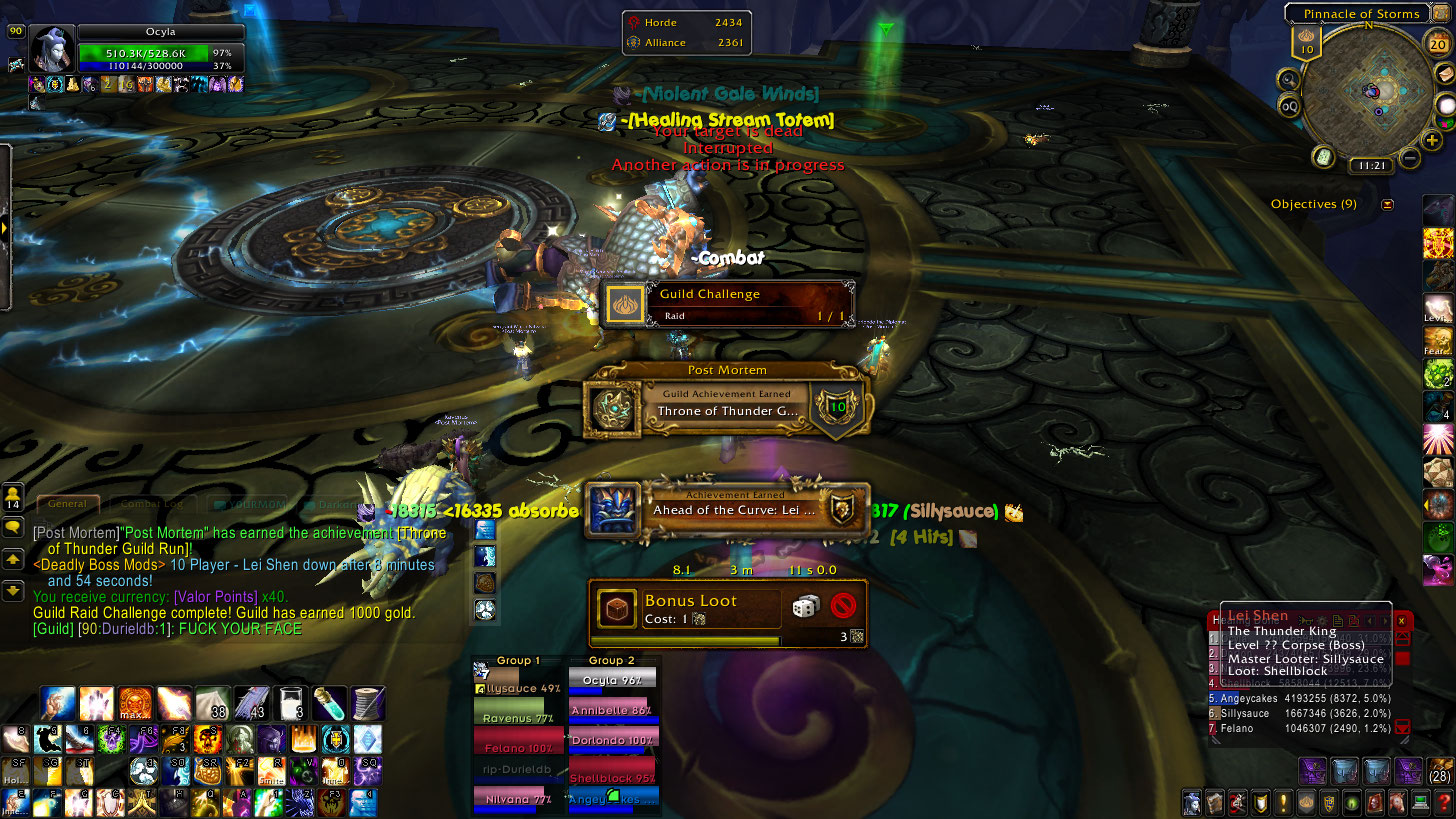 We did however, finally get Lei Shen, I think it took 4 pulls only because I wasn’t able to see any of his spell effects until I rebooted, so it was mostly my fault I think. The fight was pretty easy.
