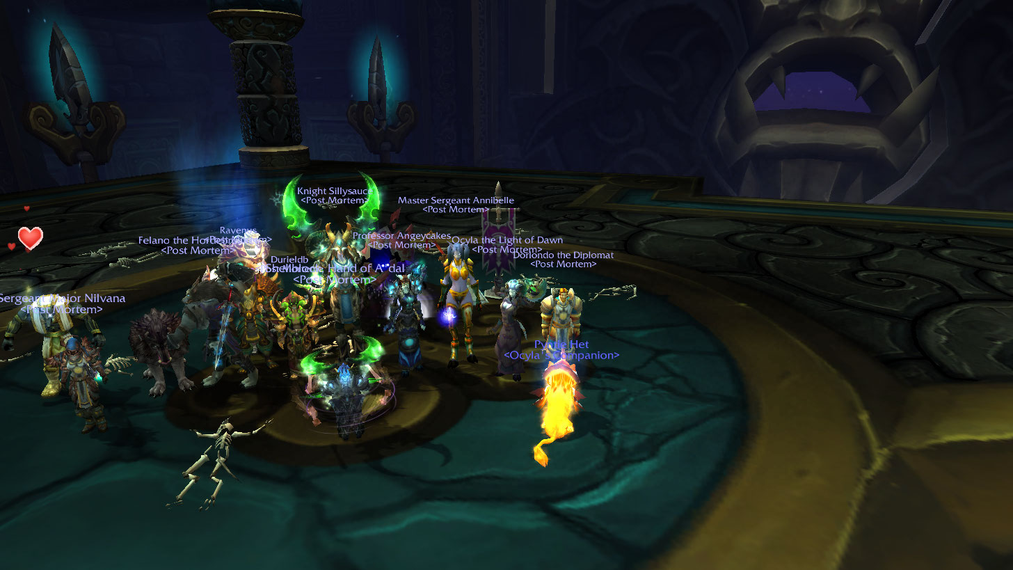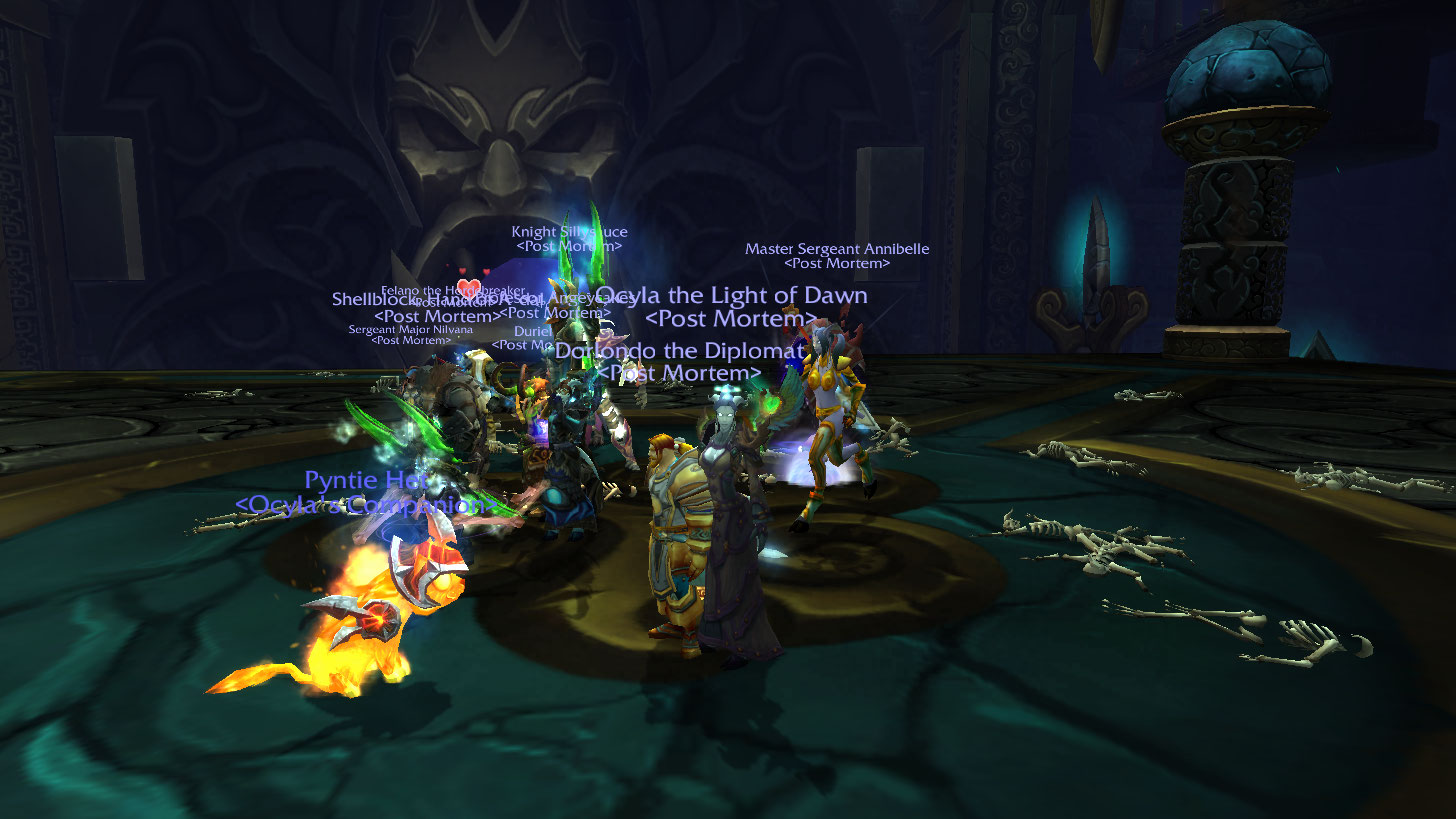 Last Tuesday, we were down Shellblock, who was an hour late, and Angey who was even MORE late. That meant the rest of us got to stand around that whole time and do nothing. Oh and Onenightstab left the guild.