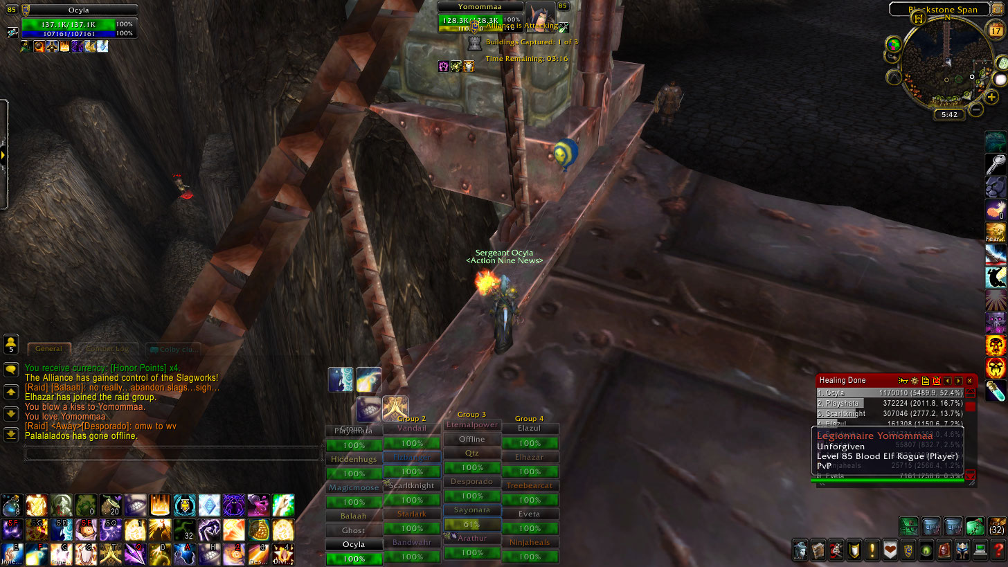 Later on we had, which had to be without a doubt, the WORST Tol Barad battle I’ve ever been in. I started out on my shaman and ran to ICG, where I remained solo nearly the entire time while it turned. Then horde flooded in and took it back. I switched to my priest, and it just got even worse from there. We had people staying as ghosts and doing nothing but walking around, we had rogues staying in stealth and merely watching while I took a beat down trying to find someone to heal. We had people die and stay dead the entire time, then we had seriously about half the raid, just leave. Horde had probably 5-8 people at every single base, we had maybe 15 people total, with only 5 trying to attack. We went a good 15 mins at 0/3.