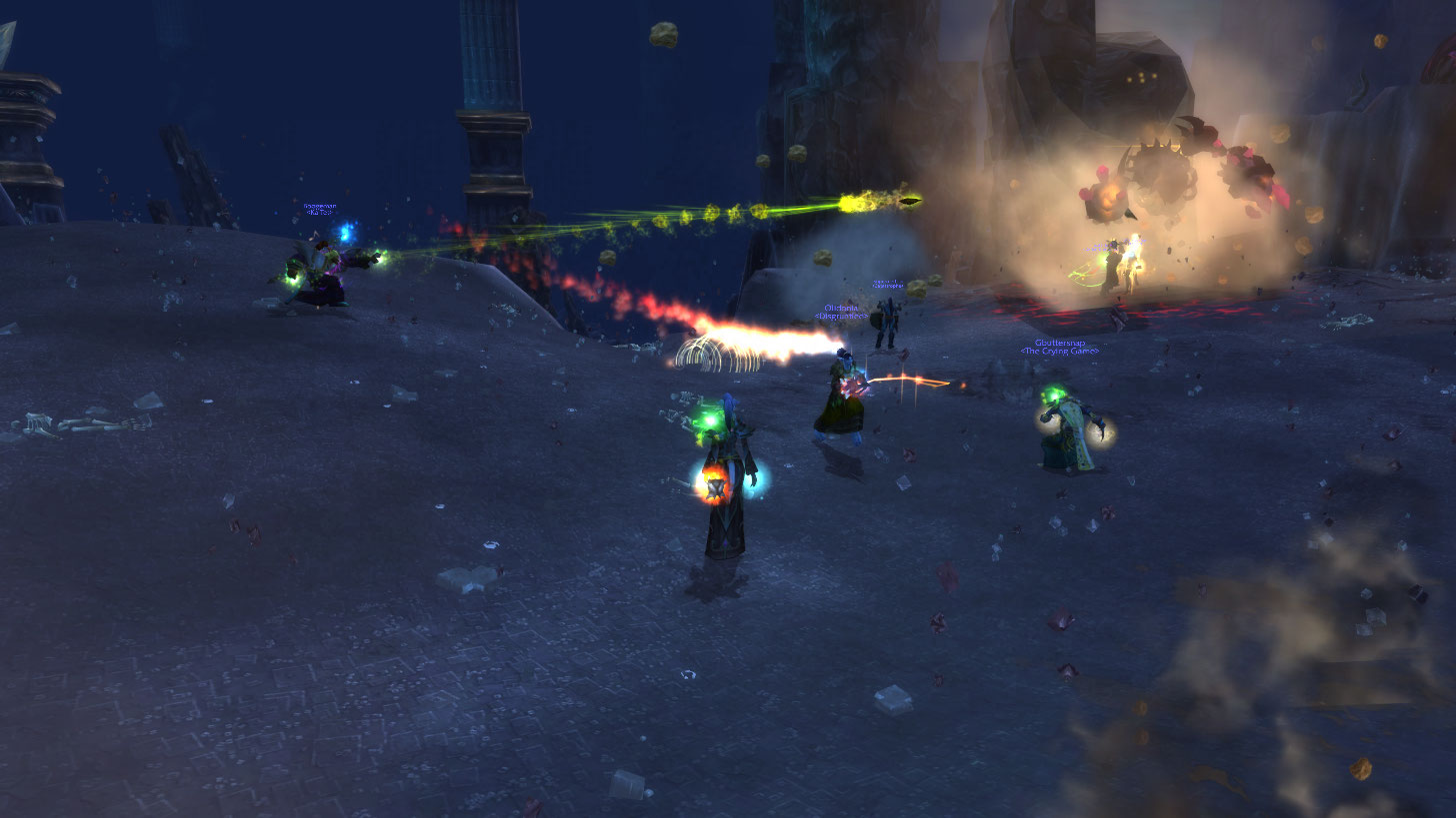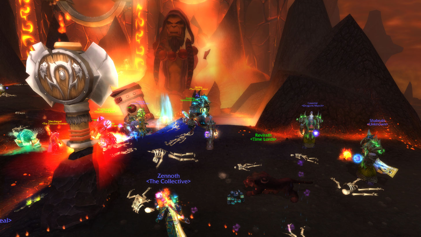 Then we’re off to Firelands where Thrall is on fire and you have to defend Aggra’s totems. I joined up with two mages and killed a bunch of horde, and nearly died to a warrior, but other alliance helped peel him off me. I’ve been getting a beat down by warriors quite a bit in fact, ran into THREE in TB that teamed up and killed me, and one persistent, difficult one by the name of Isenguard gave me a real hard time. Was impressed honestly.
