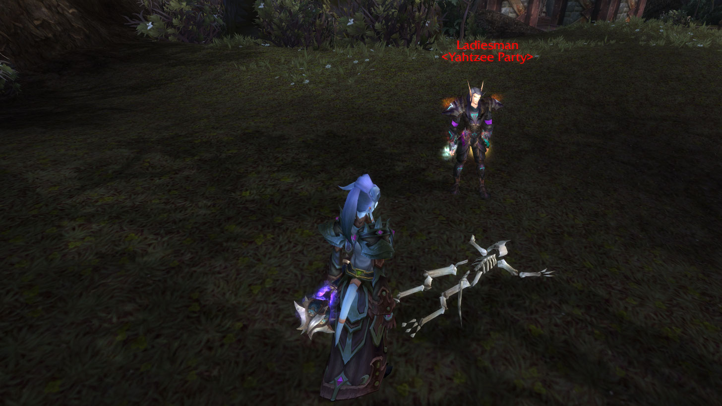 Afterwards I got in 2 kills by doing my usual guard trick. We must have really confused that bbqtwilight warlock since we were both standing around flagged, outside of the guards, not killing each other. My alliance card, it’s gone, you can hear it being ripped in the wind already. He did kill me at least once, though. Today I learned, by him being sassy and saying my skeleton was cute, that draenei skeletons do indeed have a tail bone, and horns. That’s attention to detail for ya XD