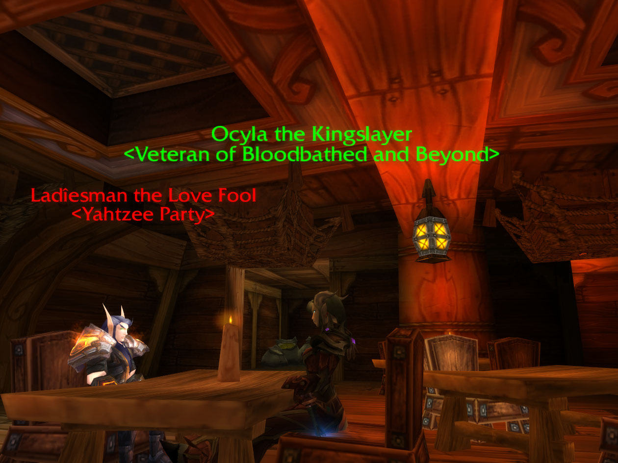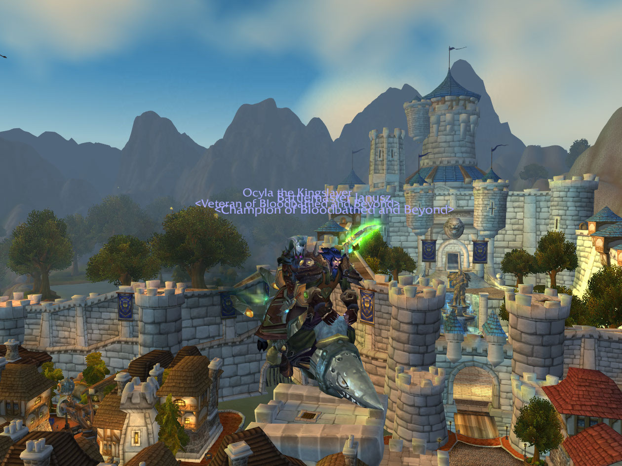 After the battle, we go back on the boat and sit down. So, this was a little funny actually, I didn’t die the whole TB battle before this, and I went up to South Spire to wait out my flagged status. Well we were messing around trying to kill each other but not really, since I have nothing to kill a rogue anyway, when a disc priest comes up on the fight. They start assisting me so naturally I have to behave myself and start really stunning/fearing, and I save the disc priest from almost death by throwing a Guardian Spirit at the right time. We chase back over the bridge, where a hunter and a mage horde, I think, join in and try to kill me. I survive to the guards but at that point, after about 5 mins of fighting I go OOM and die, but the guards kill both horde.