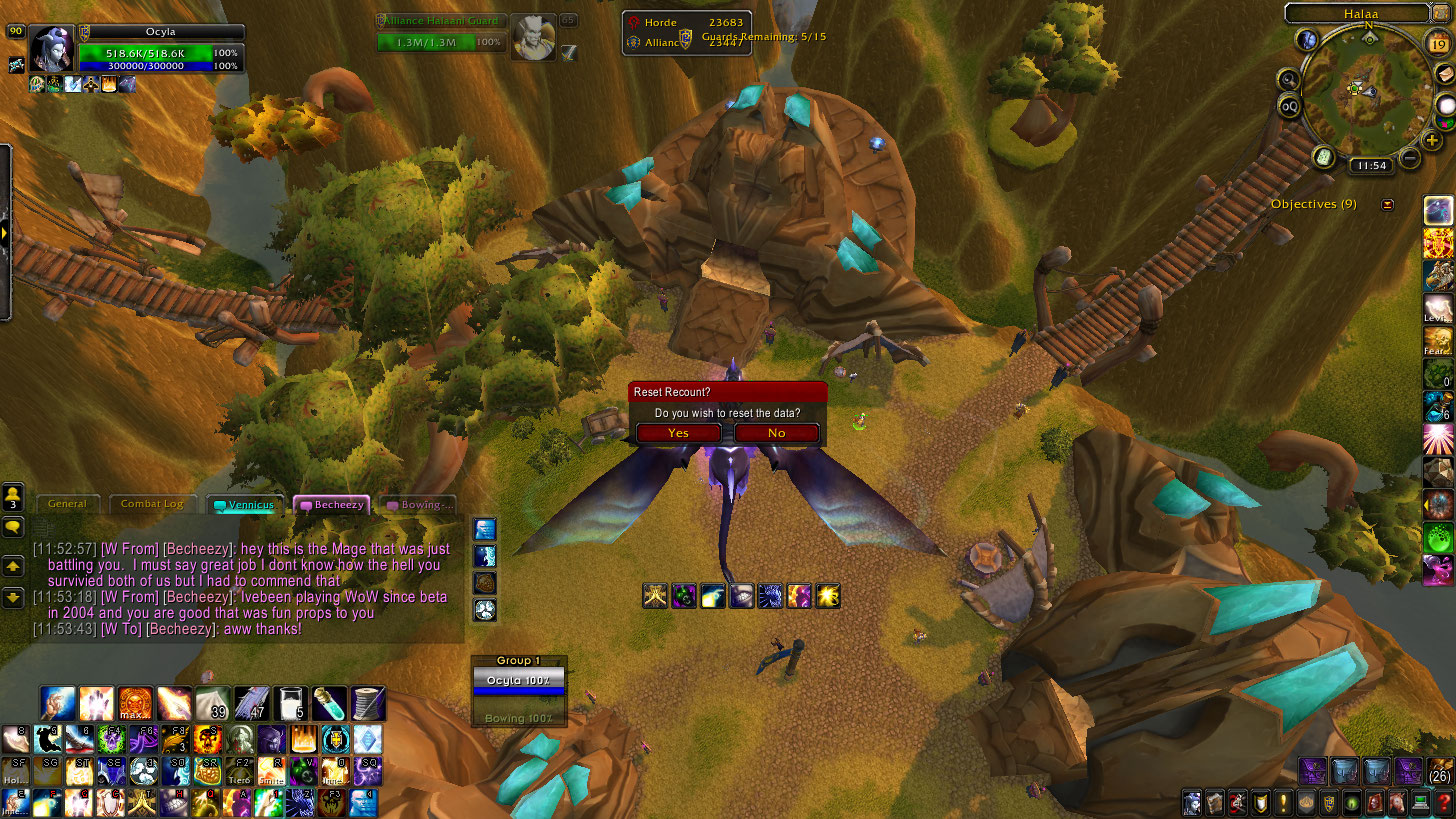 The nasty priest I picked up some nasty tips from showed up in Halaa in the afternoon. But before I get to that, the mage that I easily kill solo showed up a few times. He also showed up with a hunter, and I killed him with both of them attacking, then turned and killed the hunter. That must have been embarrassing. The mage then came on his alliance paladin to tell me I was good: