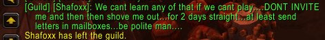 The short of it, I was right, Brdlady left guild today after bitching about not getting in raids, after her friend Shafoxx threw a fit and also left. This was during a raid so most of us didn’t have time to properly address the bitching, either. Jan was trying to explain the logistics of why you don’t swap out new people into a raid all the time, but they didn’t care.